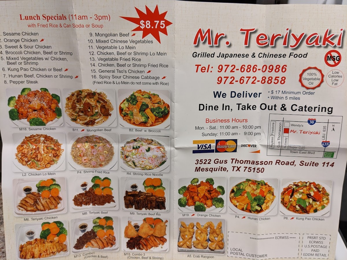Welcome to Mr. Teriyaki, a beloved gem located at 3522 Gus Thomasson Rd, Mesquite, TX. Renowned for its fresh, hot dishes, Mr. Teriyaki consistently impresses visitors with its quality and flavor. Diners rave about the Sweet and Sour Chicken, especially when cooked lightly for tender perfection. The extensive menu offers a delightful variety, from sesame chicken to tasty lunch specials for just $8.99, complete with soup or soda.